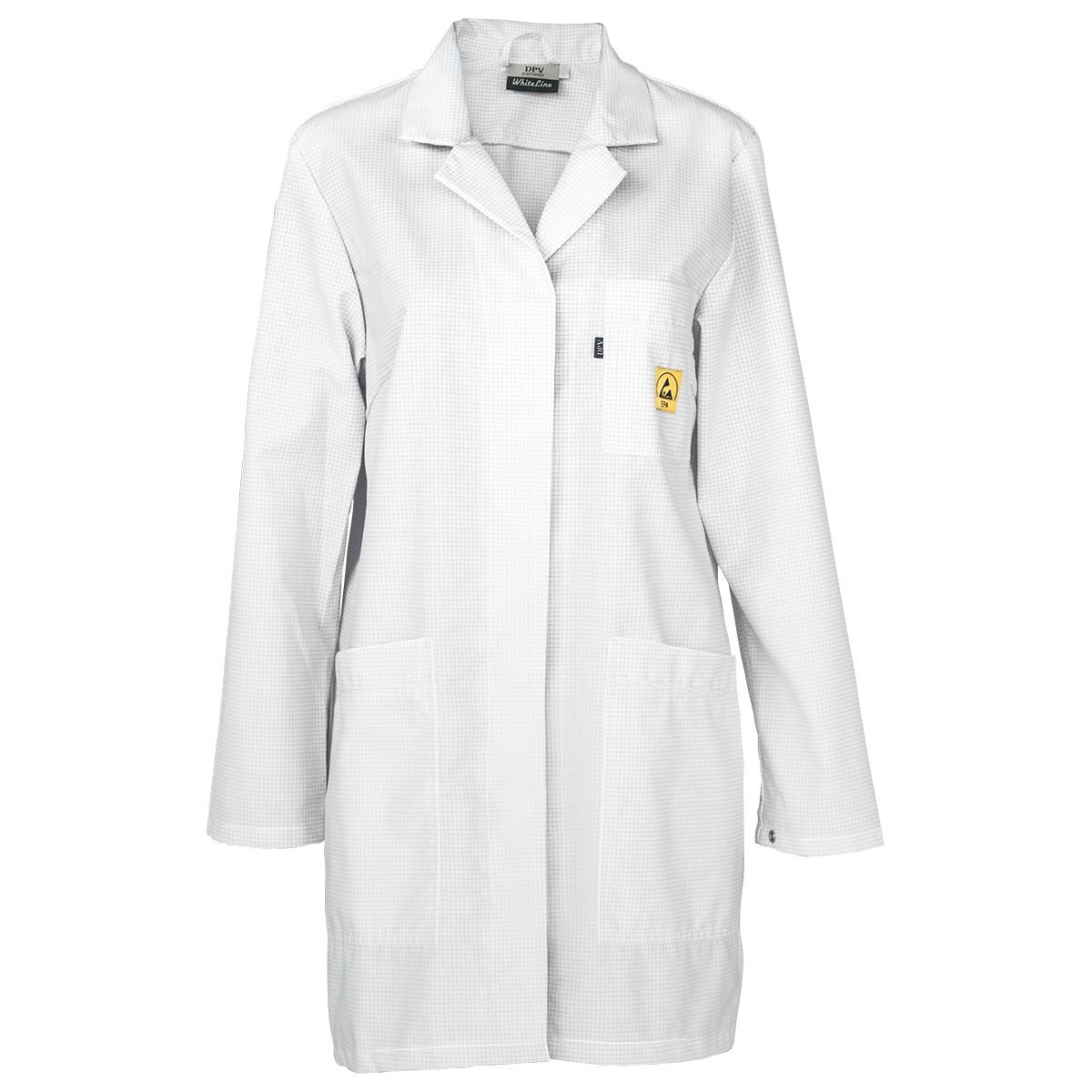Arbeidsfrakk med to sidelommer og en brystlomme med vevd ESD-varselsymbol.