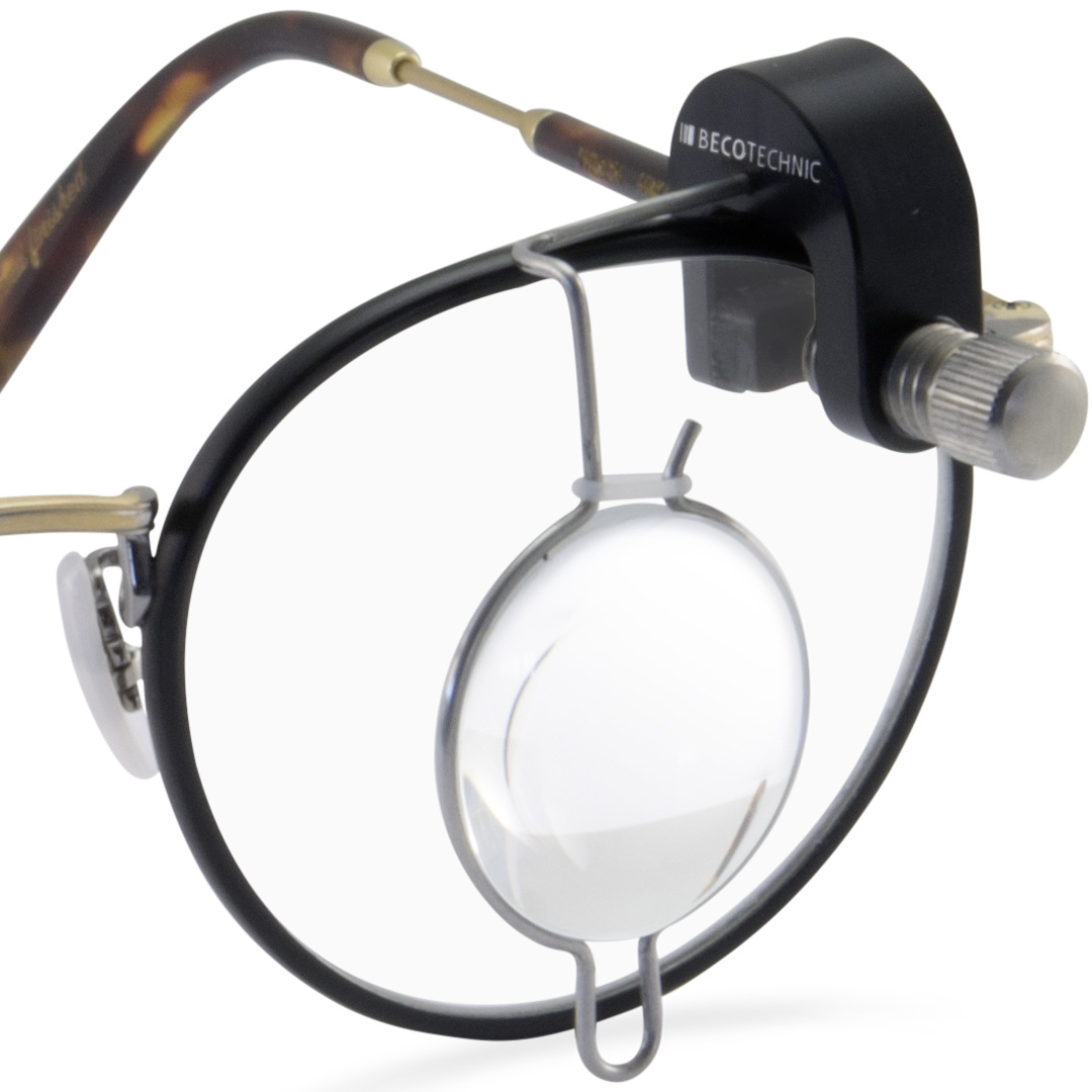 Lett, men stabilt forstørrelsesglass som kan festes sikkert til brilleglasset med en justeringsskrue.