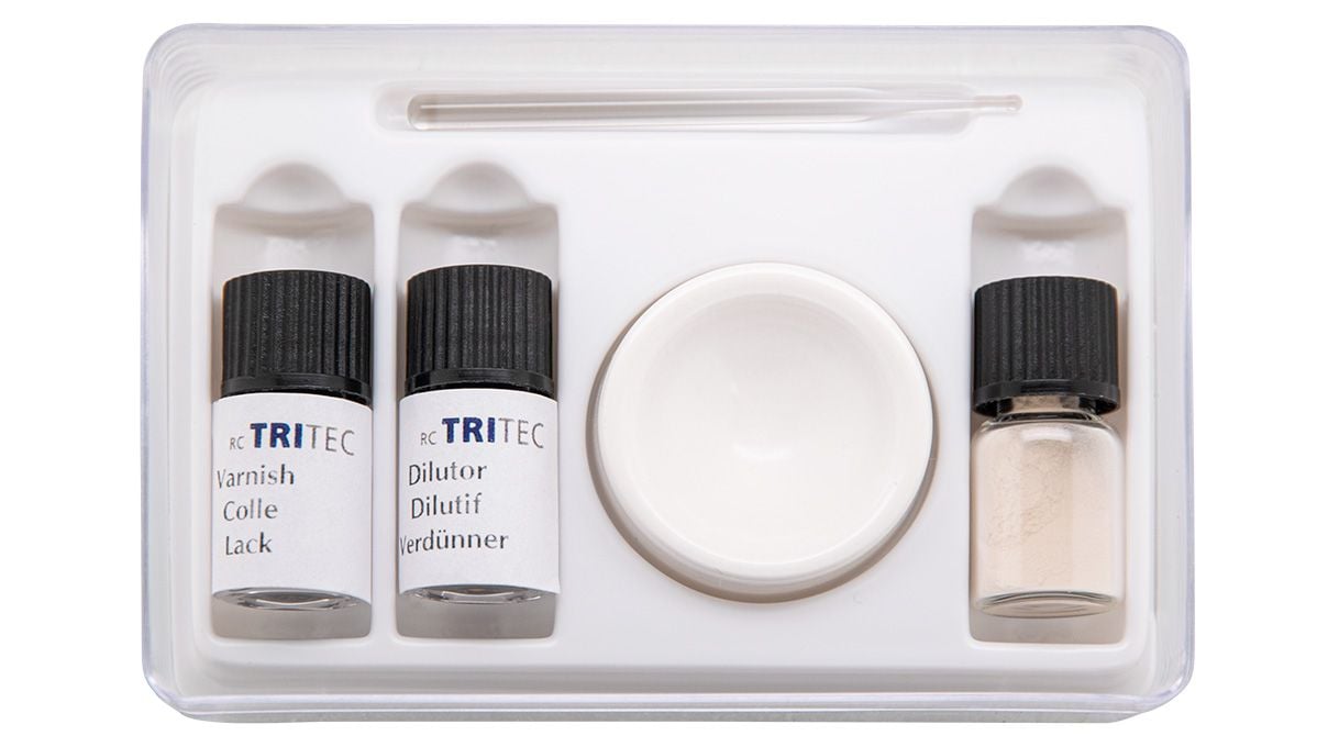 Settet inneholder fargepulver, fortynner, lakk, blandekopp, og legger.