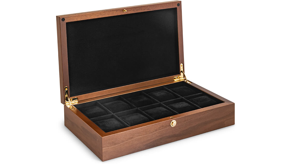 I tre med elegant, valnøtt finér, matt For i sort fløyel Leveres uten dekor H x Br x D: 80x340x130mm Vekt: 2,0 kg