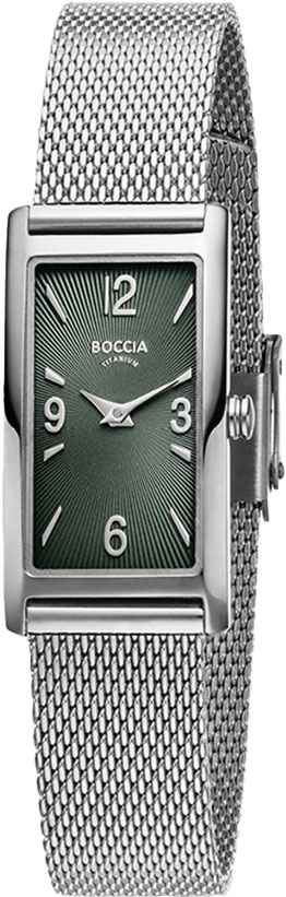 BOCCIA ur med rektangulær titankasse, stål meshlenke og grønn tallskive.