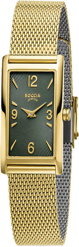 BOCCIA ur med rektangulær titankasse, PVD meshlenke og grønn tallskive.