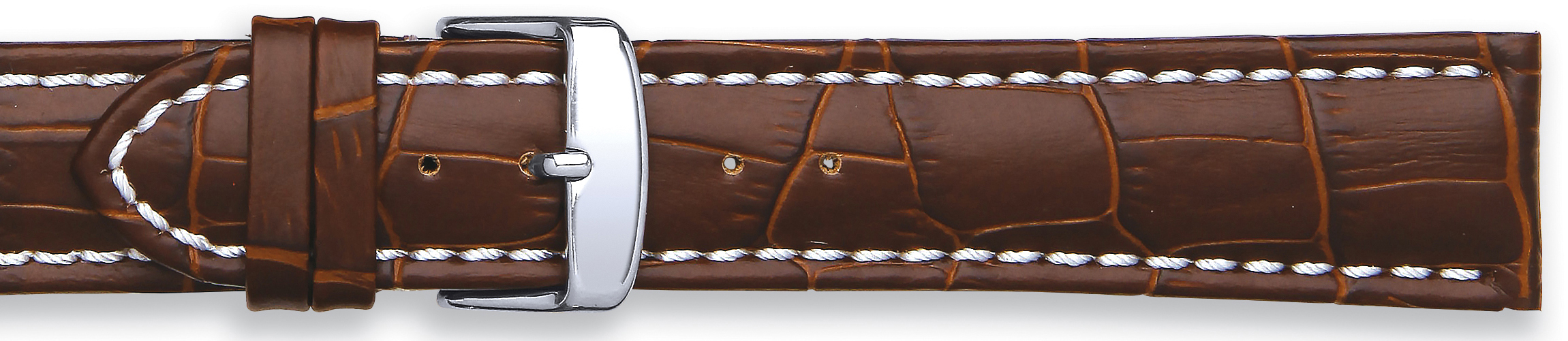 Kraftig rem med alligatormønster og hvit søm.