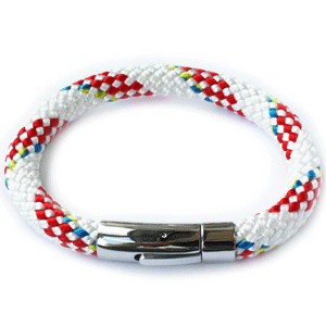 Seilerarmbånd av nylontau med 8mm tykkelse, med klikklås i polert stål. ?Låsen er fjærbelastet, og åpnes når man trykker på knappen. 21cm lengde, andre lengder kan bestilles.