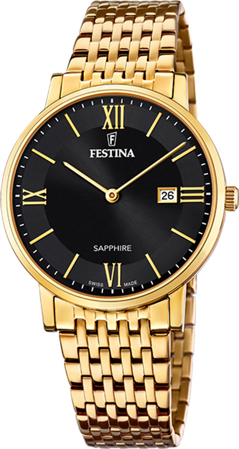 Festina Swiss Made, herre, lenke, PVD, sort skive, romertall, safirglass, 5 ATM, Ø 39,3 mm