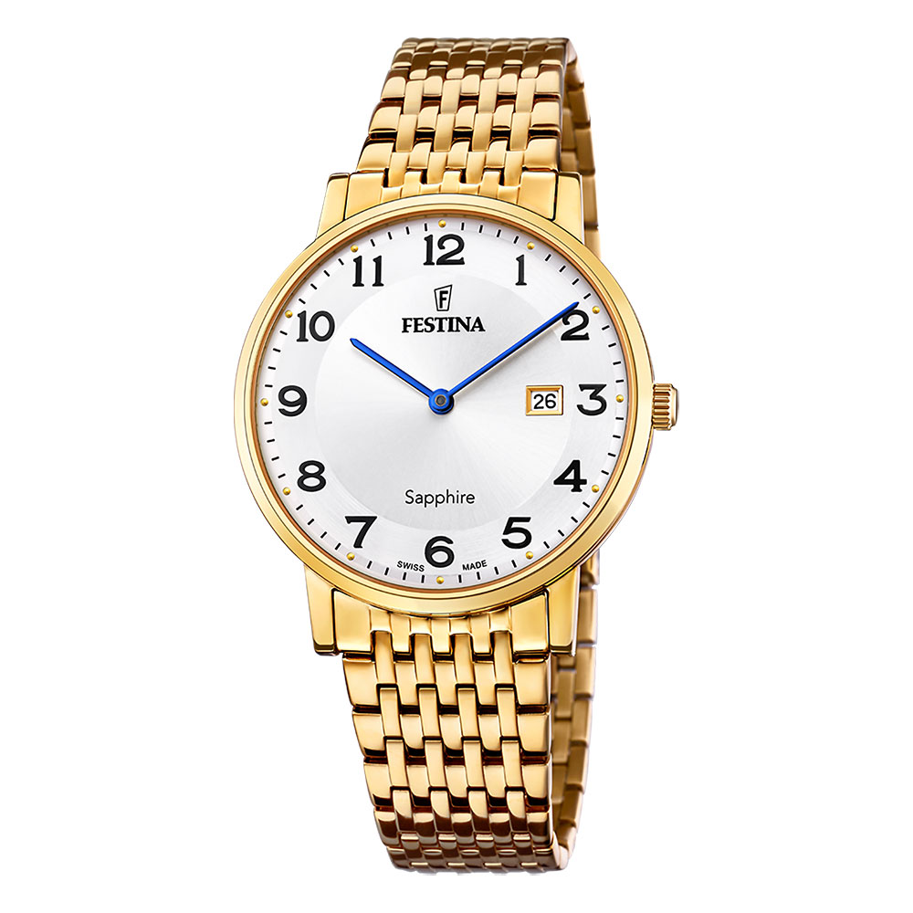 Festina Swiss Made, herre, lenke, PVD, hvit skive, tall, safirglass, 5 ATM, Ø 39,3 mm