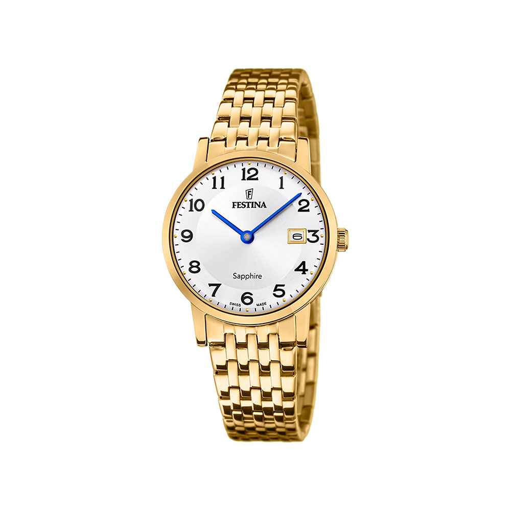 Festina Swiss Made, dame, lenke, PVD, hvit skive, tall, safirglass, 5 ATM, Ø 29,3 mm