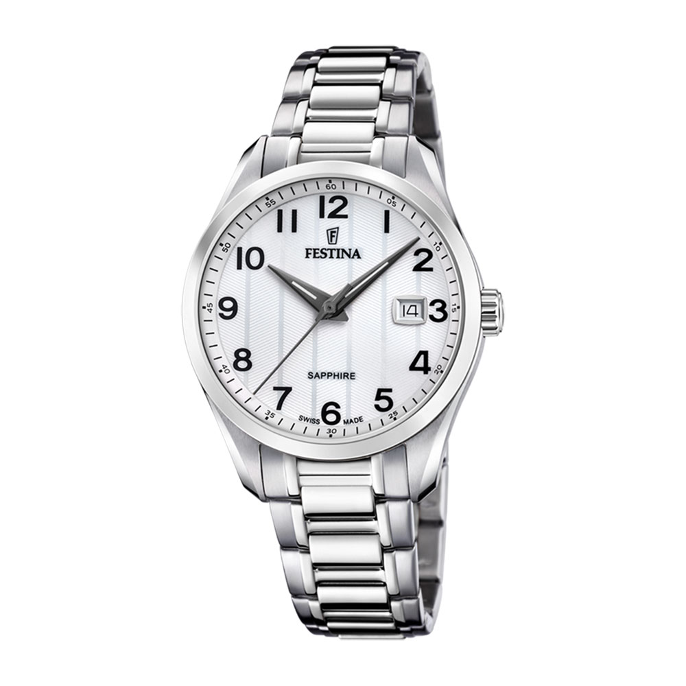 Festina Swiss Made, herre, lenke, hvit skive, tall, safirglass, 5 ATM, Ø 37,5 mm