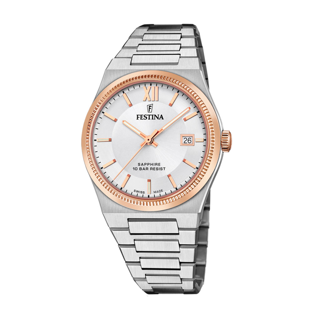 Festina Swiss Made, herre, lenke, bicolor, rose, hvit skive, safirglass, 10 ATM, Ø 40 mm *