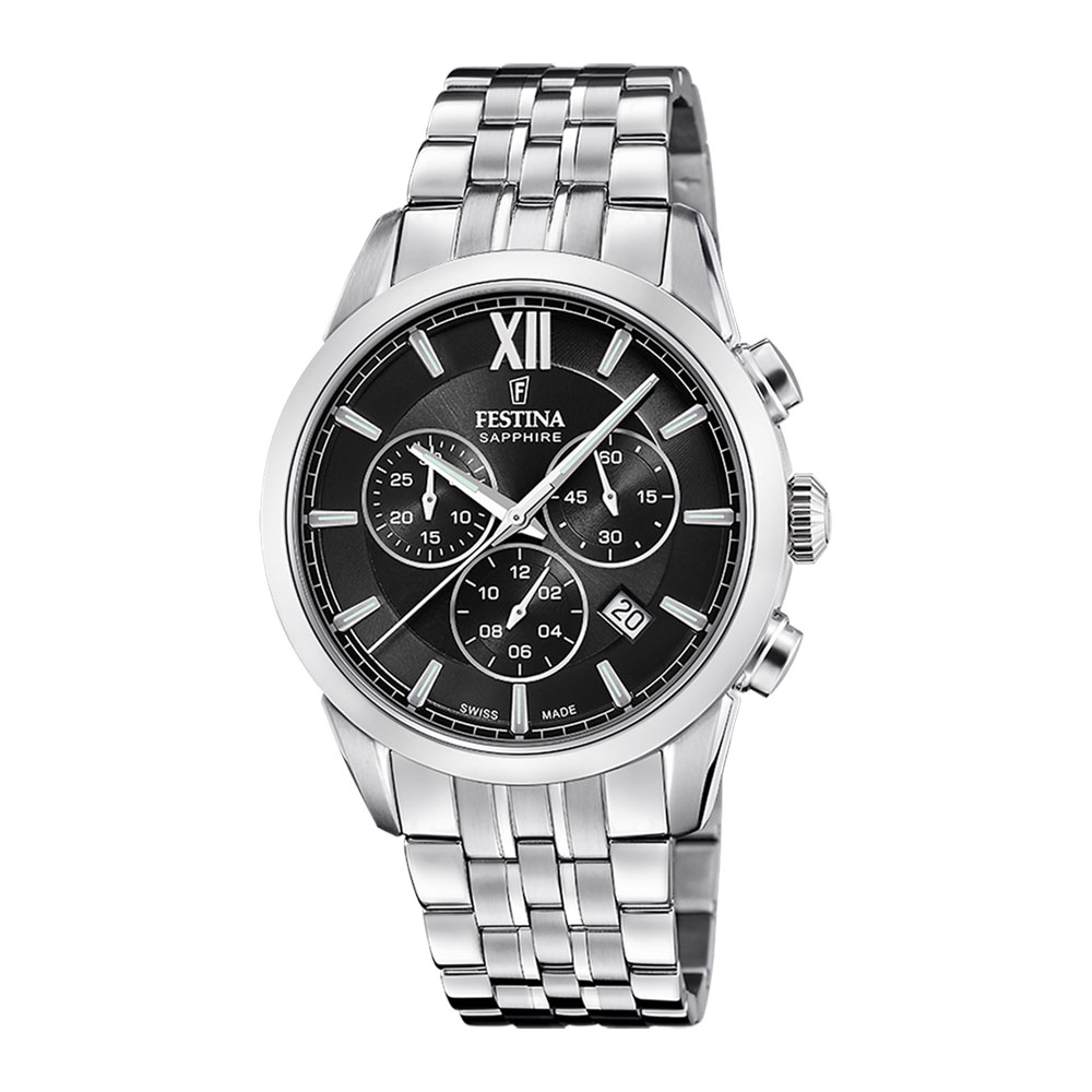 Festina Swiss Made, herre, lenke, chrono, sort skive, safirglass, 10 ATM, Ø 41 mm