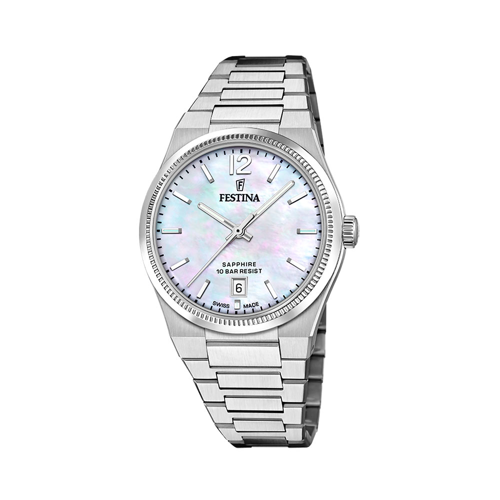 Festina Swiss Made, dame, lenke, perlemorskive, safirglass, 10 ATM, Ø 35 mm