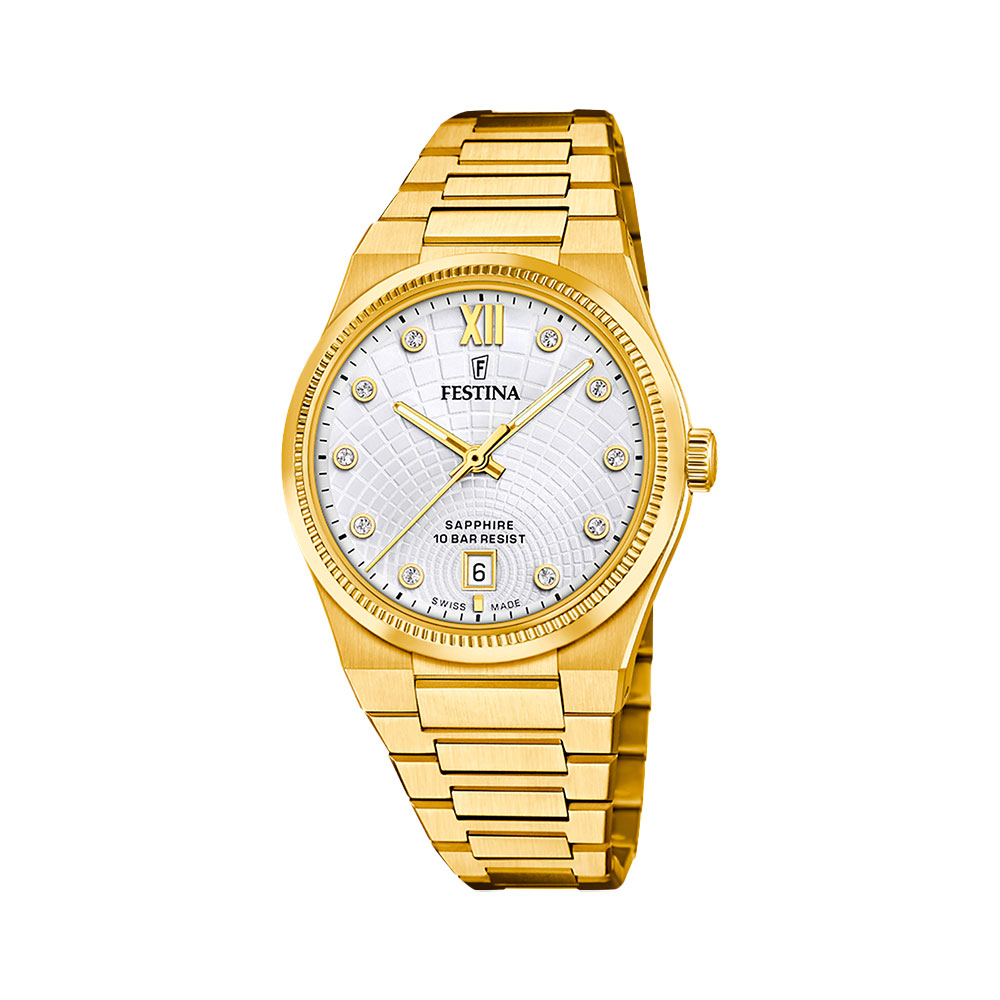 Festina Swiss Made, dame, lenke, PVD, hvit skive med steiner, safirglass, 10 ATM, Ø 35 mm