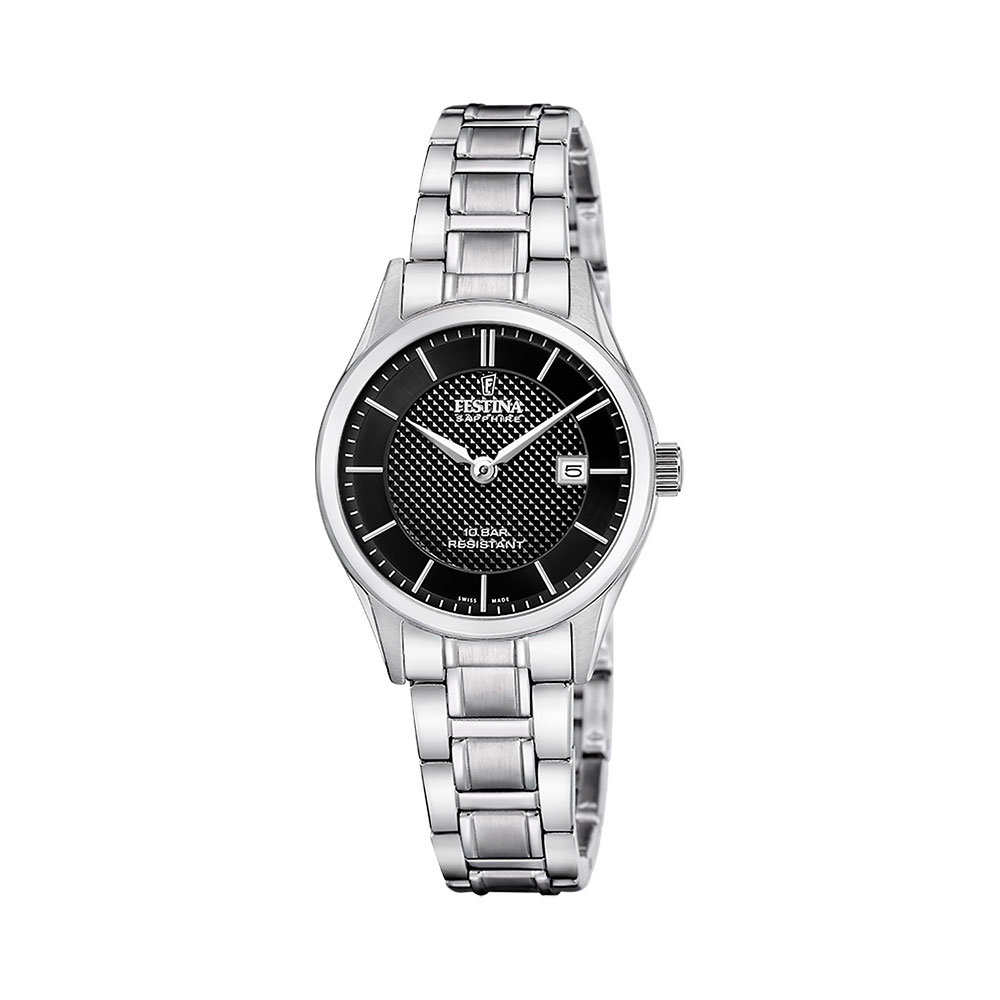 Festina Swiss Made, dame, lenke, sort skive, safirglass, 10 ATM, Ø 29 mm