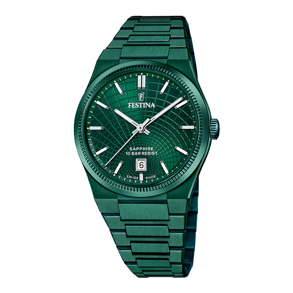 Festina Swiss Made, herre, lenke, grønn PVD, safirglass, 10 ATM, Ø 40 mm