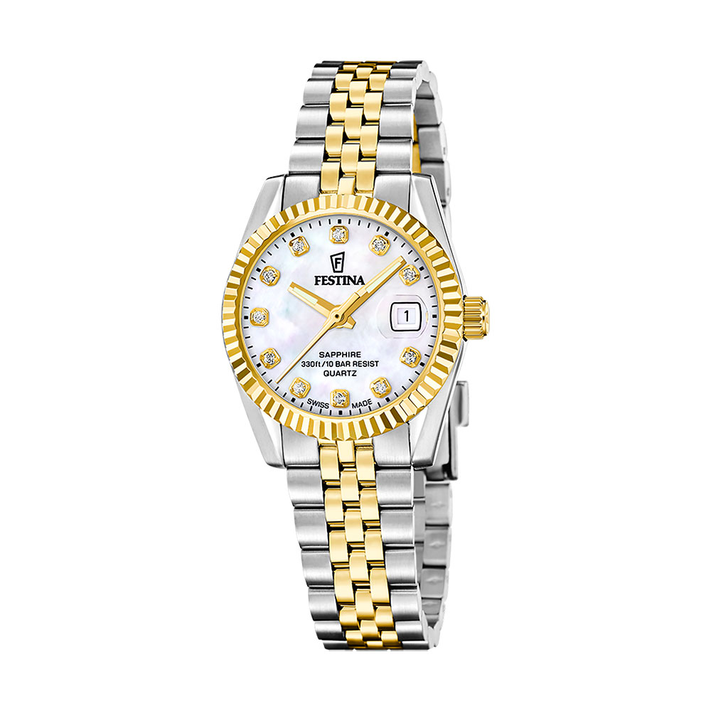 Festina Swiss Made, dame, lenke, bicolor, perlemorskive, safirglass, 10 ATM, Ø 29 mm