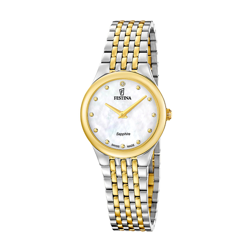 Festina Swiss Made, dame, lenke, bicolor, perlemorskive, safirglass, 5 ATM, Ø 29 mm