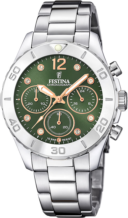 Festina stål, chrono, lenke, grønn skive, 100m *