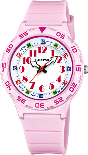Calypso barneur, 10 atm, Ø 30 mm, rosa rem/hvit skive