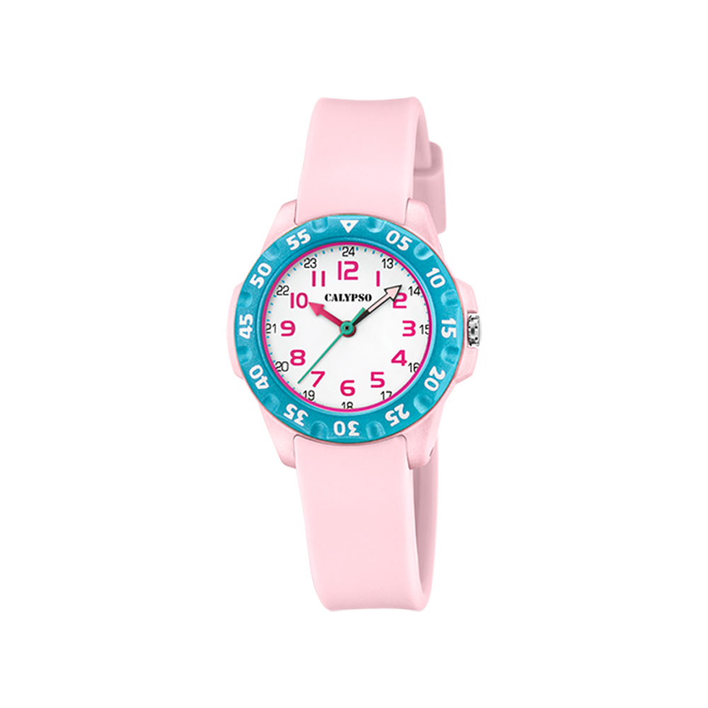Calypso barneur, 10 atm, Ø 30 mm, rosa rem/hvit skive