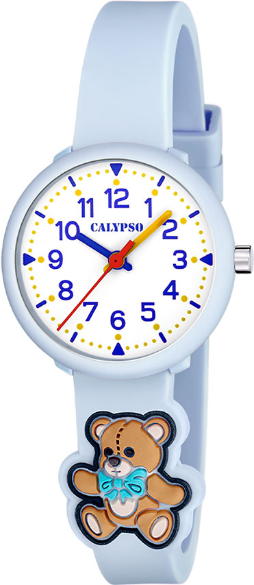 Calypso barneur 3 atm, Ø 29 mm, bamse, lyseblå rem, hvit skive