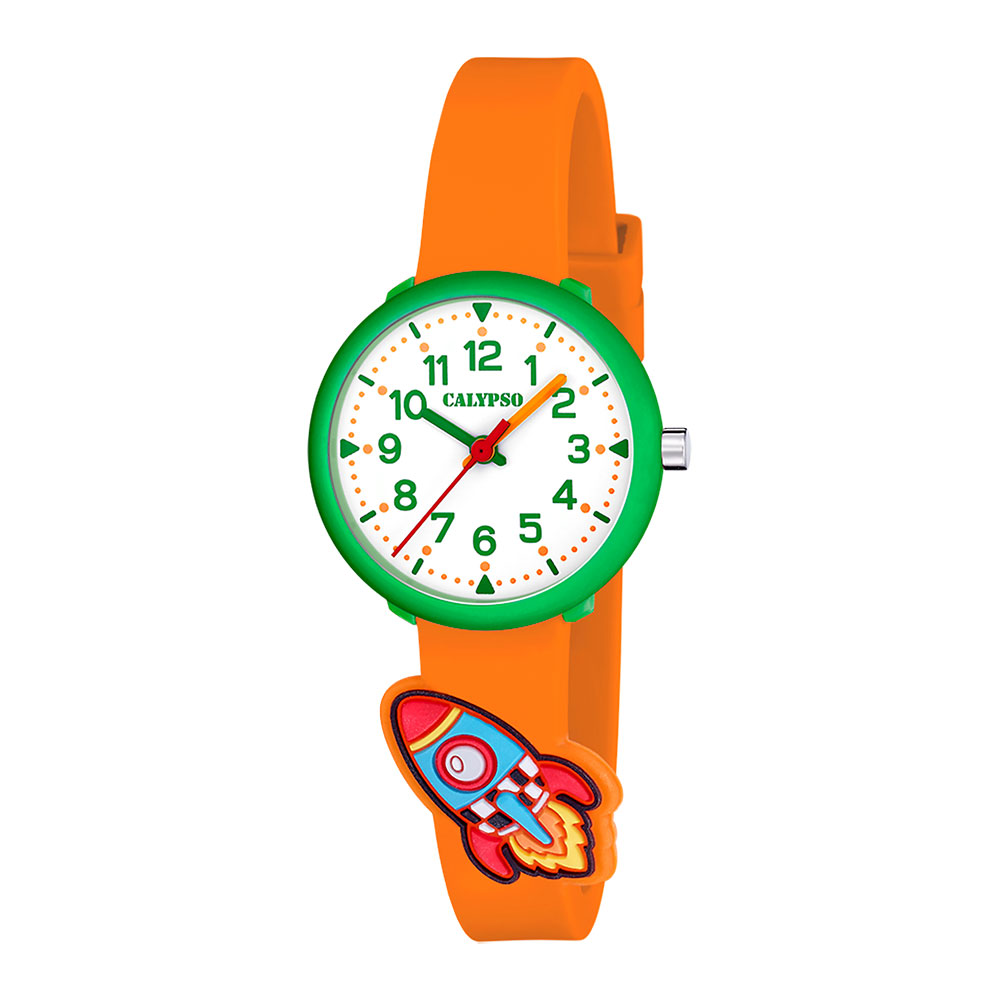 Calypso barneur 3 atm, Ø 29 mm, rakett, oransje rem, hvit skive