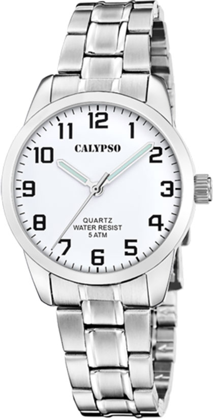 Calypso, 5 atm, Ø 32 mm, mineralglass, stål, lenke, hvit skive
