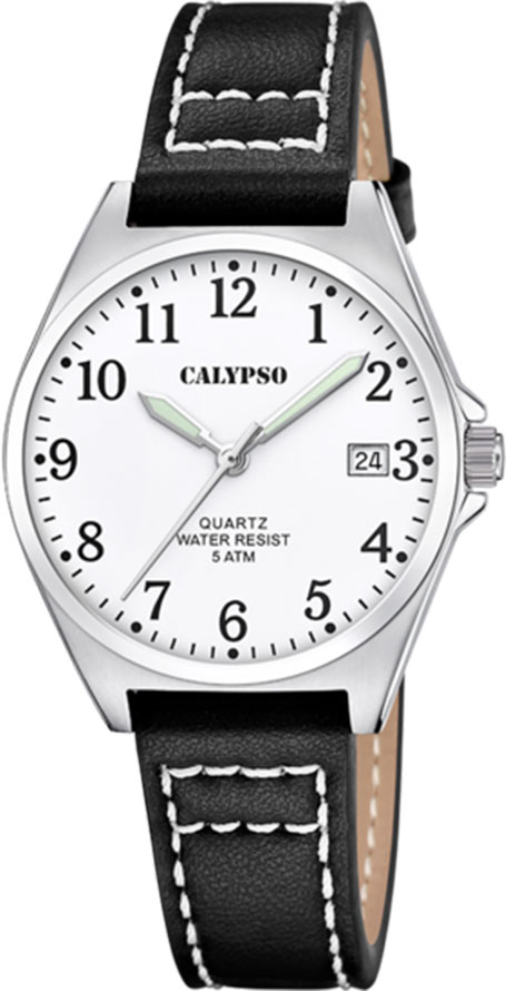 Calypso, 5 atm, Ø 32 mm, mineralglass, stål, sort rem, hvit skive