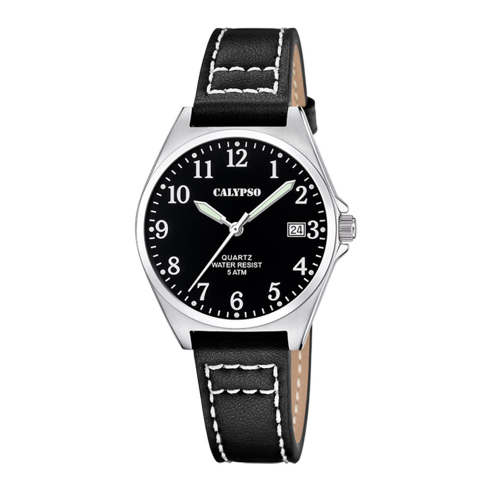 Calypso, 5 atm, Ø 32 mm, mineralglass, stål, sort rem, sort skive