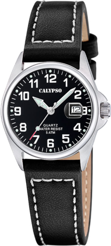Calypso, 5 atm, Ø 29,7 mm, mineralglass, stål, sort rem, sort skive